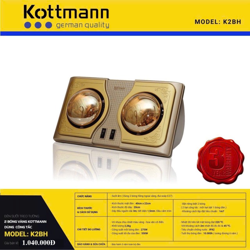 Đèn sưởi nhà tắm Kottmann 2 bóng